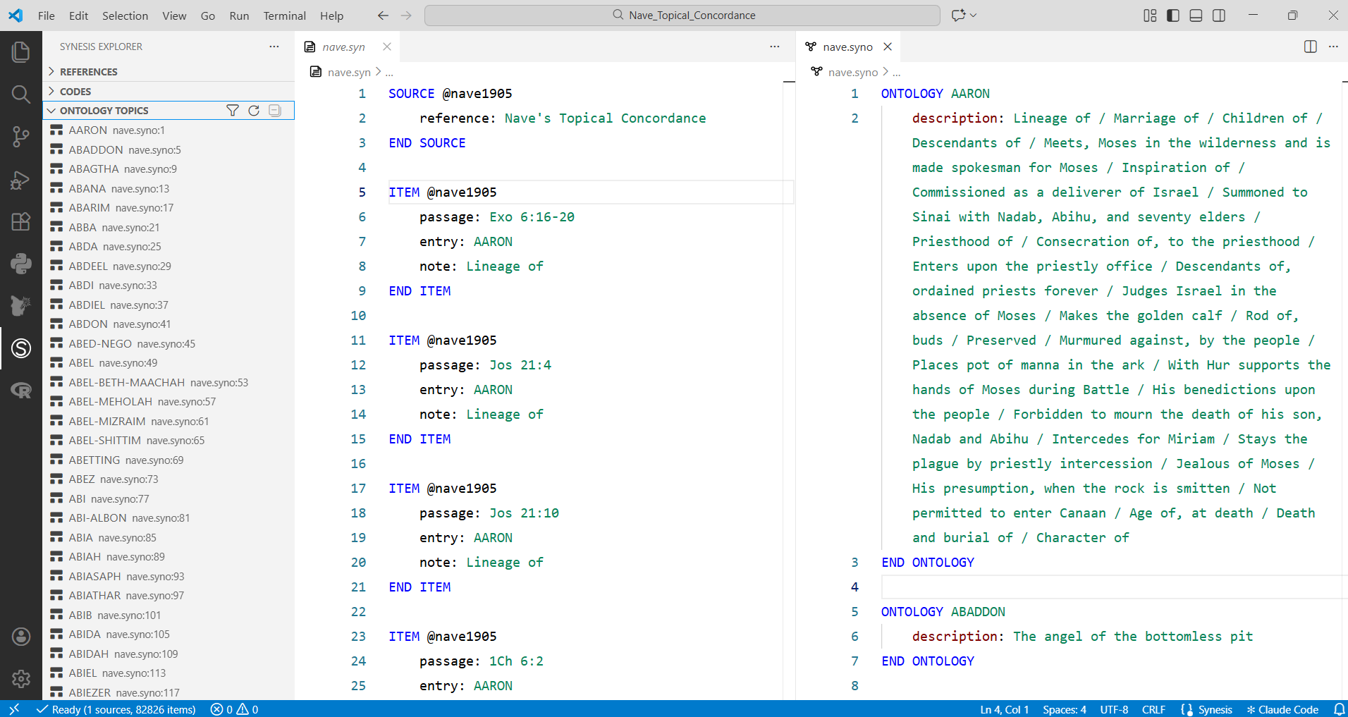 O repositório de estudos de caso do projeto contém versões prontas para uso da Thompson Chain-Reference Bible e do Nave’s Topical Concordance em linguagem Synesis — duas das mais importantes obras de referência da hermenêutica cristã, agora em formato interoperável e consultável programaticamente. Ambas as obras estão em domínio público; versões digitais originais podem ser obtidas gratuitamente em Crosswire.org.