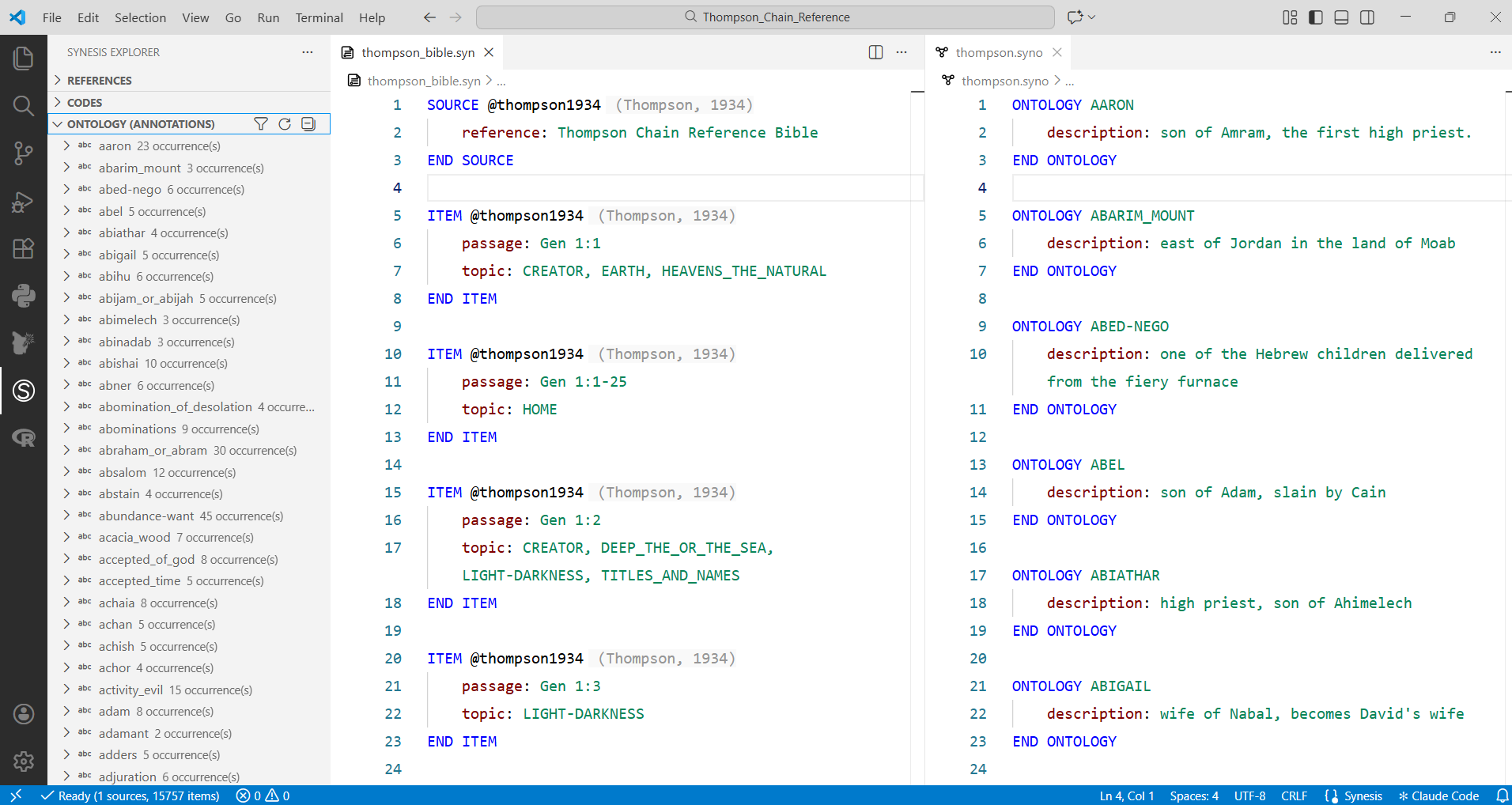 No contexto das Escrituras, Synesis funciona como uma concordância programável: em vez de consultar um índice fixo, o pesquisador constrói seu próprio sistema de referências, com os critérios e categorias que desejar. O resultado é um corpus anotado que pode ser consultado, expandido e visualizado de formas que nenhum sistema manual consegue oferecer.